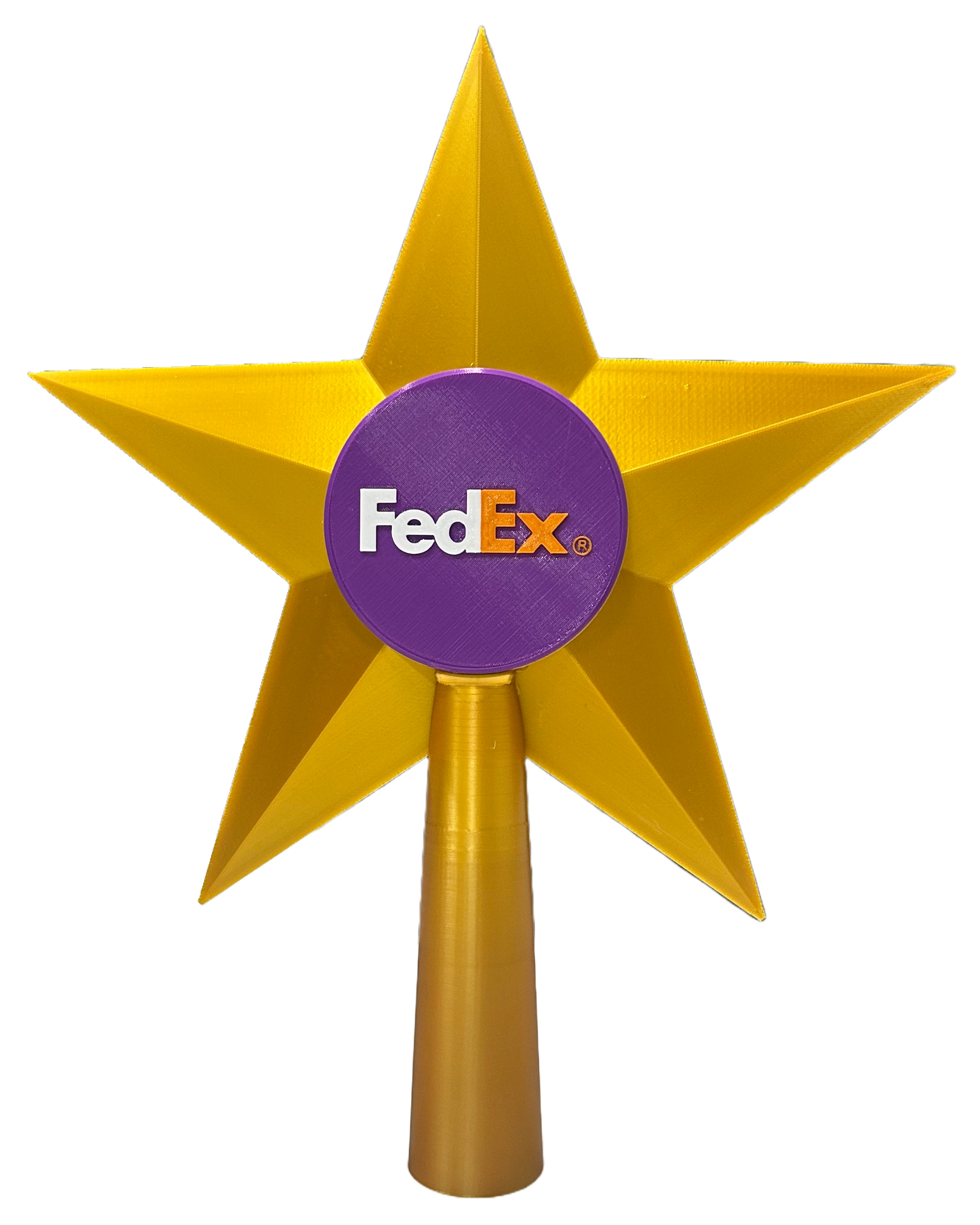 Yellow star-shaped award with a purple circular center featuring the FedEx logo.